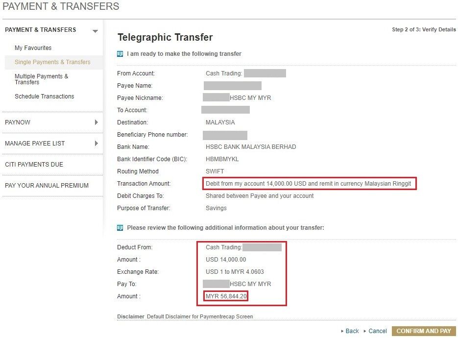 以下の手順で数年分の金額をCitibank SGからHSBC MYへ送金した。