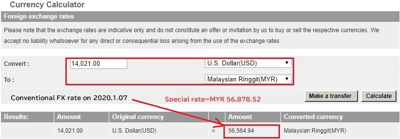 提示レートもそれ程悪くなく14,000 USD→56,844.20 MYRである。